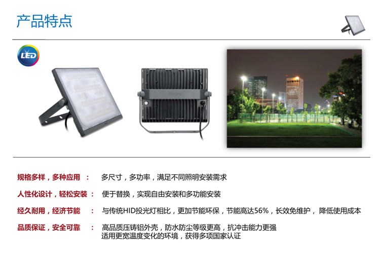 :规格多样,多种应用 : 多尺寸,多功率,满足不同照明安装需求 人性化设计,轻松安装 : 便于替换,实现自由安装和多功能安装 经久耐用,经济节能 : 与传统HID投光灯相比,更加节能环保,节能高达56%,长效免维护, 降低使用成本 品质保证,安全可靠 : 高品质压铸铝外壳,防水防尘等级更高,抗冲击能力更强 适用更宽温度变化的环境,获得多项国家认证