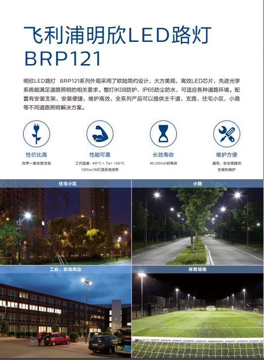 明欣LED路灯 BRP121系列外观采用了欧陆简约设计,大方美观,高效LED芯片,先进光学